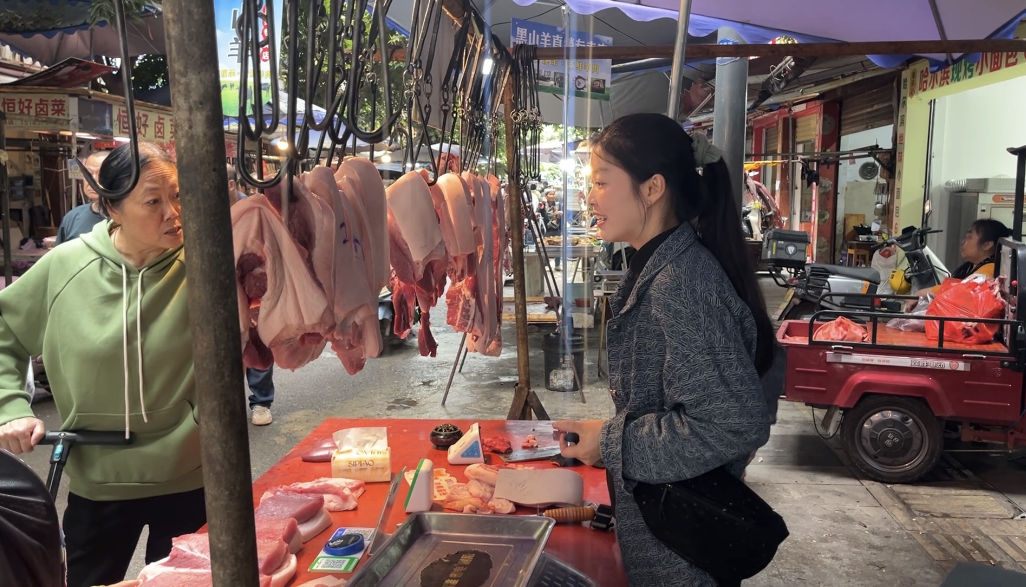 在掏出3元“块票”后,摊主主动询问老人是否需要桌上剩余的肥肉块,得到肯定答复后将肉赠予老人,并叮嘱“你拿回去熬油,油渣炒莲花白好吃”。