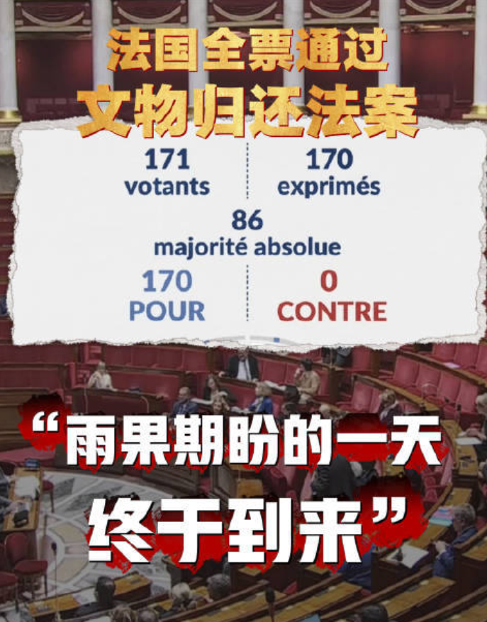 该法案适用范围是1815年至1972年间法国获取的文物。法国国民议会与参议院达成一致后进入最终表决程序。此外,议员们还投票通过条款,要求政府每年公布涉嫌非法获取文物清单。